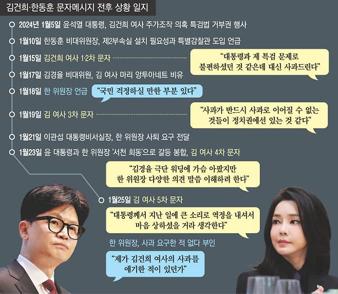 김건희 여사는 지난 1월25일 당시 국민의힘 비상대책위원장이었던 한동훈 당대표 후보에게 이 같은 문자메시지를 보냈다. 대통령실이 한 후보의 비대위원장 사퇴를 요구하는 상황까지 갔던 윤석열·한동훈(윤·한) 갈등이 김 여사 때문에 불거졌다는 점이 당사자를 통해서는 확인된 것이다.