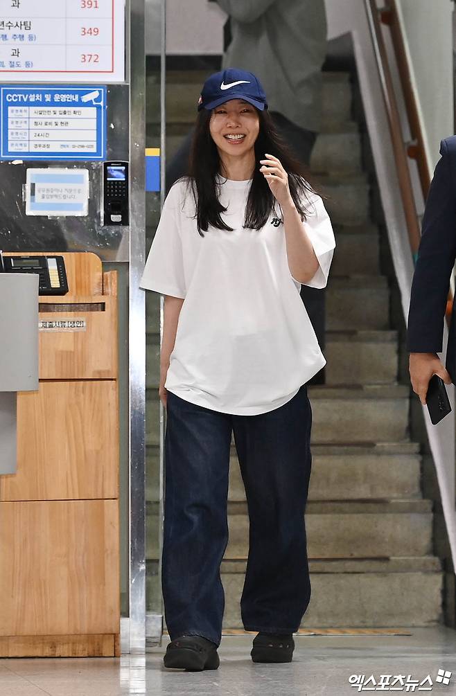 민희진 대표 '볼캡에 뉴진스 굿즈 티셔츠 입고'[포토]
