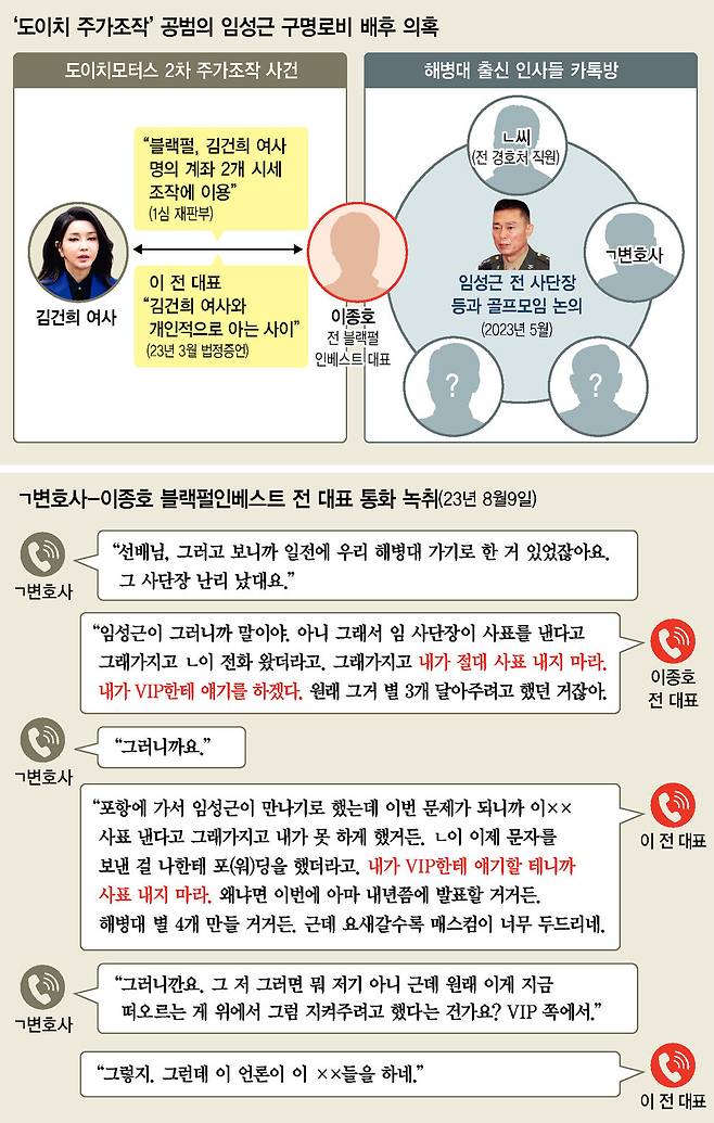 김건희 여사가 연루된 도이치모터스 2차 주가조작 사건의 ‘컨트롤타워’로 지목된 인물이 ‘임성근 구명 로비를 브이아이피(VIP)에게 했다’고 주변에 말한 녹취가 공개되면서 ‘채 상병 순직 사건 외압 의혹’과 김 여사 간 연결고리가 수면 위로 떠올랐다. 윤석열 대통령이 특별한 인연도 없던 임성근 당시 해병대 1사단장을 콕 짚어 ‘혐의자에서 빼라’고 격노했다는 점 때문에 격노의 배경을 두고 여러 의혹이 제기되던 상황이었다. 고위공직자범죄수사처(공수처)는 ‘구명 로비’의 실체를 밝히기 위한 수사에 착수했다.