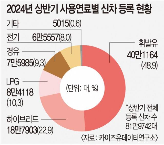 하이브리드차 등록 비중이 반기 기준 20%를 넘은 것은 처음이다. 휘발유차(40만1164대·48.9%)에 이어 전체 2위를 차지했다. 지난해 상반기까지만 해도 경유차(16만8219대·18.4%)가 하이브리드차(15만1118대·16.5%)보다 1만7000대가량 많이 팔렸다.