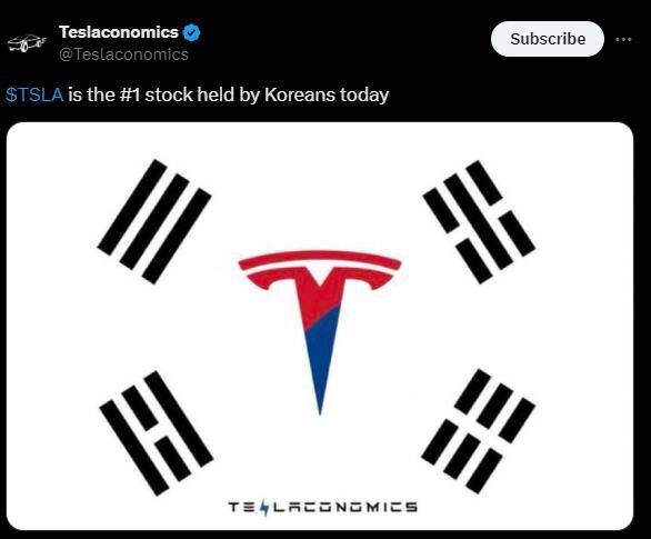 이 계정에 "테슬라는 한국인이 가장 많이 보유한 주식"이라는 글이 올라오자, 여기에 대한 답글로 이같이 적은 것입니다.