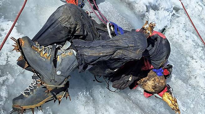 시신 위에 덮였던 눈과 얼음 영향으로 옷, 하네스, 로프, 등산화 등은 거의 원형을 유지했다고 경찰은 전했습니다.