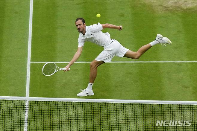 [런던=AP/뉴시스] 다닐 메드베데프(5위·러시아)가 9일(현지시각) 영국 런던의 올잉글랜드 클럽에서 열린 윔블던 테니스대회 남자 단식 8강전에서 얀니크 신네르(1위·이탈리아)와 경기하고 있다. 메드베데프가 풀세트 접전 끝에 3-2(6-7 6-4 7-6 2-6 6-3) 역전승을 거두고 4강에 올라 카를로스 알카라스(1위·스페인)와 결승 진출을 다툰다. 2024.07.10.