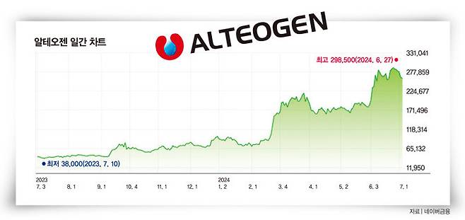 1월 9만8500원으로 출발한 주가는 6월 27일 장중 한때 29만8500원을 찍었다(그래프 참조). 7월 3일 종가 기준 25만8500원으로 조정받고 있기는 하지만, 시가총액 13조7389억 원으로 코스닥시장 2위 자리를 굳건히 지키고 있다. 엄민용 신한투자증권 연구원은 이 기업의 현 시가총액에 대해 "굉장히 저렴한 가격으로 보고 있다"면서 "향후 40조~50조 원 이상 갈 수 있는 기업"이라고 공개적으로 밝히기도 했다.