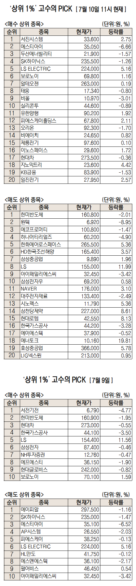 이날 미래에셋증권에 따르면 미래에셋증권 주식 거래 고객 중 최근 1개월 간 투자수익률 상위 1%에 해당하는 ‘주식 초고수’들이 오전 11시까지 가장 많이 사들인 종목은 서진시스템이었다.