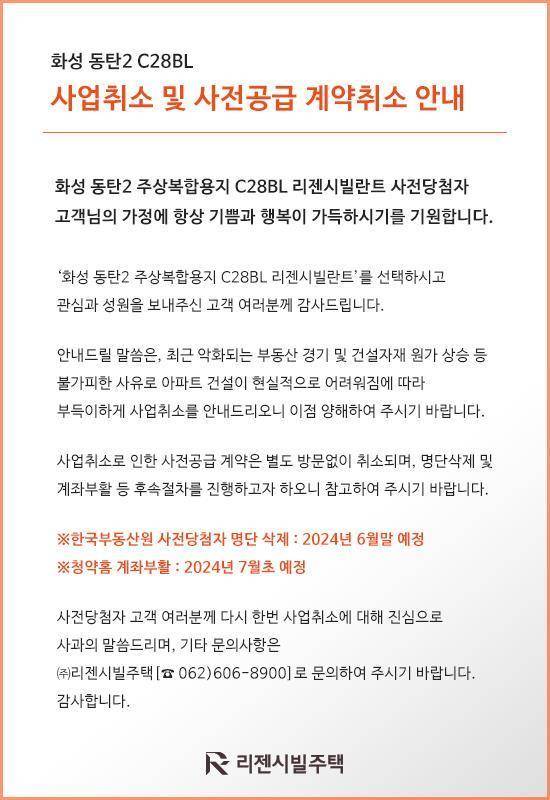 이어 "사업 취소로 인한 사전공급 계약은 별도 방문 없이 취소되며, 명단 삭제 및 계좌 부활 등 후속 절차를 진행하고자 한다"고 설명했습니다.