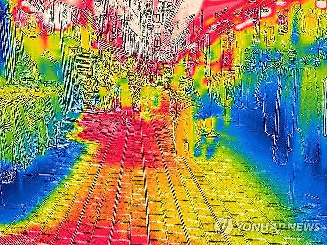 (서울=연합뉴스) 류영석 기자 = 무더위가 지속되는 10일 오후 개문 냉방 중인 서울 명동 매장들을 열화상카메라로 촬영한 모습.