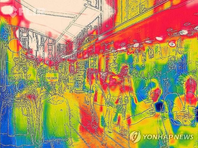 (서울=연합뉴스) 류영석 기자 = 무더위가 지속되는 10일 오후 개문 냉방 중인 서울 명동 매장들을 열화상카메라로 촬영한 모습.