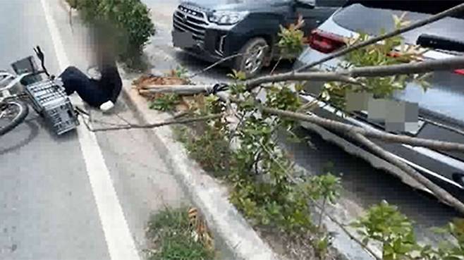 알고 보니 잎이 말라 죽은 나무가 뽑혀서 바닥에 놓여 있었는데, 자전거 운전자가 나뭇가지에 걸려 넘어진 겁니다.