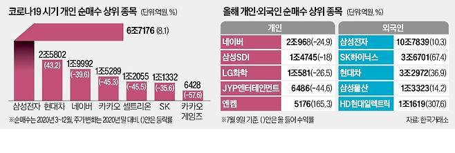 올 들어 개인과 외국인 투자자 간 성적표도 극명하게 갈렸다. 전날 기준 올해 개인 순매수 상위 5개 종목 중 4개 종목이 ‘마이너스’다. 네이버를 총 2조968억원 규모로 가장 많이 사들였지만 이 기간 수익률은 -24.9%다. 삼성SDI(-18.0%), LG화학(-26.5%), JYP엔터테인먼트(-44.6%) 등도 줄줄이 하락세다. 순매수 5위인 엔켐만 올 들어 165.3% 상승했다.