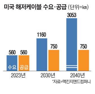 미국 해저케이블 시장은 지속적인 성장이 예상된다. 글로벌 컨설팅 기업 맥킨지앤드컴퍼니에 따르면 미국에서는 2030년 연간 410㎞의 해저케이블이 부족할 것으로 추산된다. 이 부족분은 2040년 연간 2303㎞로 늘어날 전망이다. 이는 인공지능(AI)의 등장으로 데이터센터가 급증하면서 전력 수요가 늘어나고 있기 때문으로 해석된다. 전기차와 반도체 등도 전력 수요 증가에 영향을 미치면서 전력 설비 증설이 필요한 상황이다.