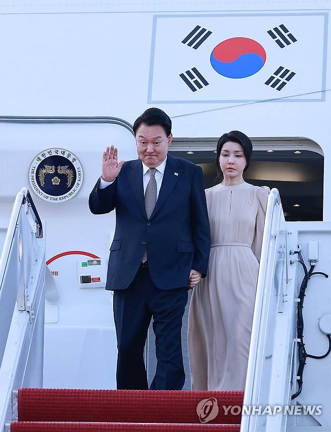 (워싱턴=연합뉴스) 홍해인 기자 = 윤석열 대통령과 김건희 여사가 10일(현지시간) 북대서양조약기구(NATO·나토) 75주년 정상회의가 열리는 미국 워싱턴DC 인근 앤드루스 공군기지에 전용기인 공군 1호기 편으로 도착해 인사하고 있다. 2024.7.10