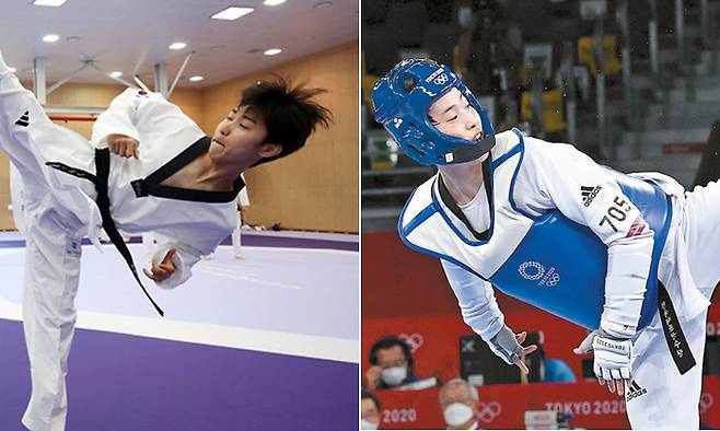 | “파리에 애국가 울린다” 3년 전 2020 도쿄 올림픽에서 ‘노골드’에 그쳤던 한국 태권도가 2024 파리 올림픽에서 종주국 자존심 회복에 나선다. 사진은 지난달 25일 진천 국가대표선수촌에서 공개훈련하는 박태준(왼쪽)과 도쿄 올림픽 결승에서 상대에게 발차기하는 이다빈. 뉴스1·세계일보 자료사진 |