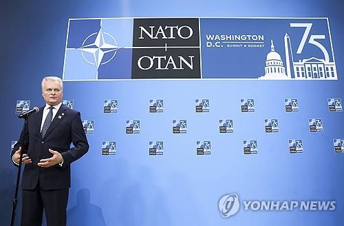 epa11470357 Lithuania's President Gitanas Nauseda speaks to members of the news media as he arrives at the NATO Summit at Walter E. Washington Convention Center in Washington, DC, USA, 10 July 2024. The 75th Anniversary NATO Summit is taking place in Washington, DC, from 09 to 11 July 2024. EPA/MICHAEL REYNOLDS
