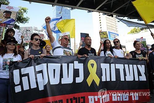 epa11470361 Families of Israeli hostages held by Hamas in Gaza and their supporters take part in a protest march against Israeli Prime Minister Netanyahu's government and calling for the release of the hostages, outside the Kirya military headquarters in Tel Aviv, Israel, 10 July 2024. Some hostage families announced that they will begin a four-day march toward the Knesset in Jerusalem. According to the Israeli military, 116 Israelis, who were abducted and taken to the Gaza Strip during the 07 October 2023 attacks by Hamas, remain in captivity. Rallies in Israel have been critical of the government's handling of the crisis, demanding the immediate release of all hostages. Banner in picture reads 'March for a deal!' EPA/ABIR SULTAN