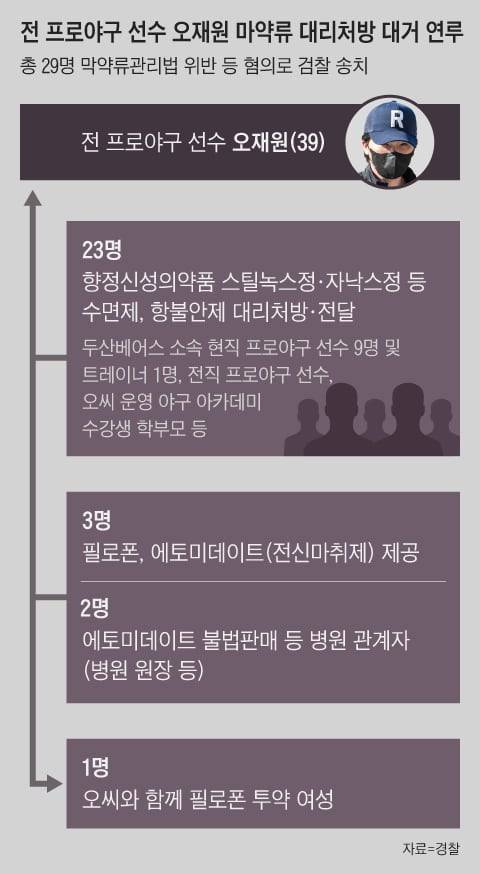 수면제를 대리 처방 받아 국가대표 출신 전 프로야구 선수 오재원(39)씨에게 전달한 혐의를 받는 피의자 29명이 검찰에 넘겨졌다. 이 중에는 두산 베어스 소속 현역 선수 8명과 트레이너 1명이 포함됐다. 프로야구 42년 역사상 한 구단에서 현역 선수 등이 이처럼 대규모로 마약 범죄에 연루된 것은 이번이 처음이다.