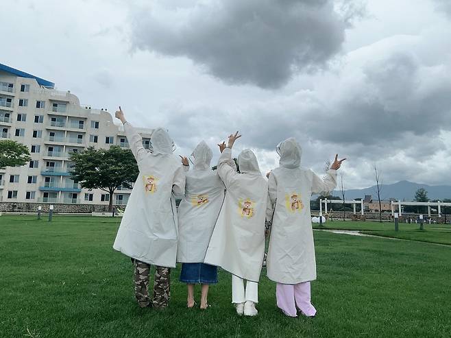 공개된 사진 속 송지은은 우비를 입고서 사진을 찍는 모습이다.