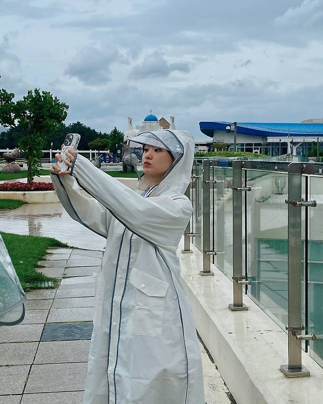 공개된 사진 속 송지은은 우비를 입고서 사진을 찍는 모습이다.