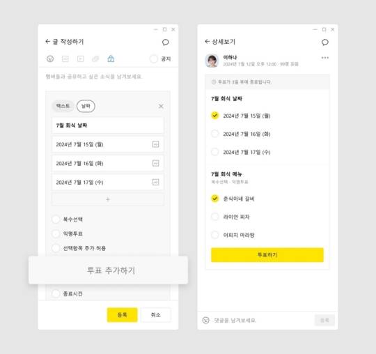 종전에는 모임 날짜만 투표를 할 수 있었다면 이제는 모임 일정과 장소, 메뉴까지 한꺼번에 투표로 결정할 수 있다.