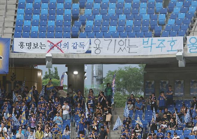 울산 팬들은 '피노키홍', '명청한 행보', 우리가 본 감독 중 최악'이라는 걸개를 들며 홍명보 감독을 향한 배신감을 표출했다.