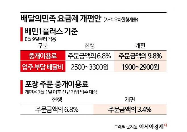 개편된 요금제는 다음달 9일부터 적용된다. 다만 배민1플러스의 업주 부담 배달비와 포장 주문 중개이용료는 인하한다. 업주 부담 배달비는 기존 2500~3300원에서 지역별로 건당 100~900원 낮출 예정이다. 서울 지역의 경우 3200원에서 2900원으로 300원 정도의 부담을 덜게 된다. 포장 주문 중개이용료율은 기존 6.8%에서 3.4%로 절반가량 낮춘다. 7월1일 이후 신규 가입 업주가 대상이다. 기존 업주들은 내년 3월까지 배달 수수료가 무료로 제공된다.