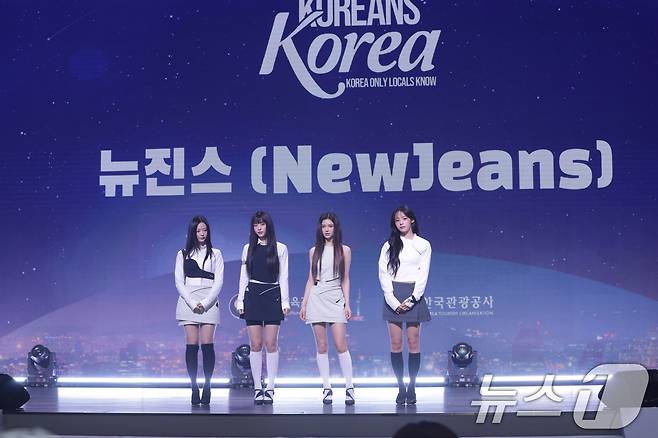 (서울=뉴스1) 오대일 기자 = 그룹 뉴진스(NewJeans)가 11일 서울 용산구 그랜드하얏트호텔에서 2024년 한국관광 명예홍보대사 위촉된 후 기념촬영을 하고 있다. (공동취재) 2024.7.11/뉴스1