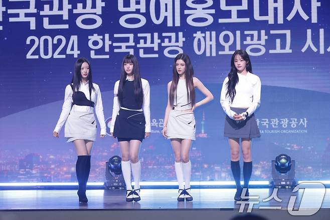 (서울=뉴스1) 오대일 기자 = 그룹 뉴진스(NewJeans)가 11일 서울 용산구 그랜드하얏트호텔에서 2024년 한국관광 명예홍보대사 위촉된 후 기념촬영을 하고 있다. (공동취재) 2024.7.11/뉴스1