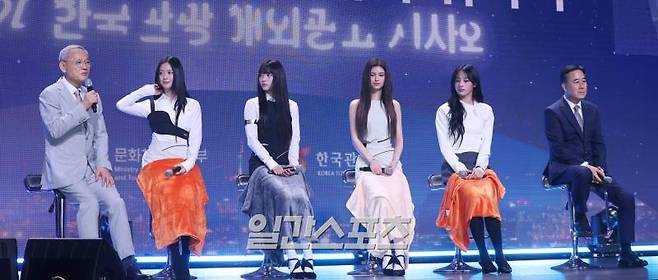 유인촌 문화체육관광부 장관, 그룹 뉴진스 하니, 해린, 다니엘, 민지, 서영충 한국관광공사 사장직무대행(왼쪽부터)이 11일 오전 서울 용산구 그랜드 하얏트 서울에서 열린 2024 한국관광 명예홍보대사 위촉식에 참석해 토크를 진행하고 있다.