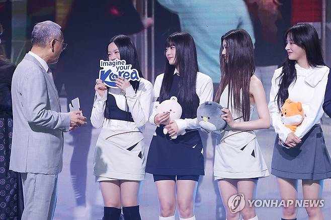 (서울=연합뉴스) 강민지 기자 = 유인촌 문화체육관광부 장관이 11일 오전 서울 용산구 그랜드하얏트호텔에서 열린 '2024 한국관광 명예홍보대사 위촉식'에서 그룹 뉴진스와 대화하고 있다. 2024.7.11