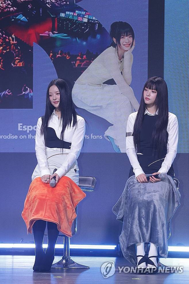 (서울=연합뉴스) 강민지 기자 = 그룹 뉴진스의 하니(왼쪽), 해린이 11일 오전 서울 용산구 그랜드하얏트호텔에서 열린 '2024 한국관광 명예홍보대사 위촉식'에서 질문을 듣고 있다. 2024.7.11