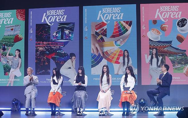 (서울=연합뉴스) 강민지 기자 = 11일 오전 서울 용산구 그랜드하얏트호텔에서 '2024 한국관광 명예홍보대사 위촉식'이 열리고 있다. 왼쪽부터 유인촌 문화체육관광부 장관, 그룹 뉴진스, 서영충 한국관광공사 사장직무대행. 2024.7.11
