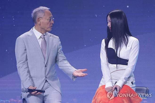 (서울=연합뉴스) 강민지 기자 = 유인촌 문화체육관광부 장관(왼쪽), 그룹 뉴진스의 하니가 11일 오전 서울 용산구 그랜드하얏트호텔에서 열린 '2024 한국관광 명예홍보대사 위촉식'에서 대화하고 있다. 2024.7.11