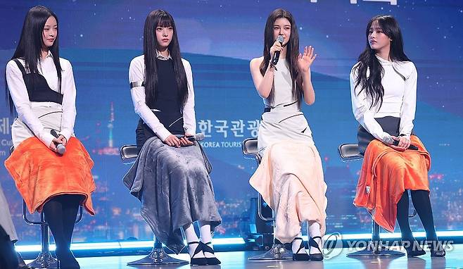 (서울=연합뉴스) 강민지 기자 = 그룹 뉴진스의 다니엘(왼쪽 세 번째)이 11일 오전 서울 용산구 그랜드하얏트호텔에서 열린 '2024 한국관광 명예홍보대사 위촉식'에서 위촉 소감을 말하고 있다. 2024.7.11 [공동취재]