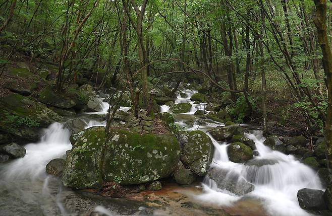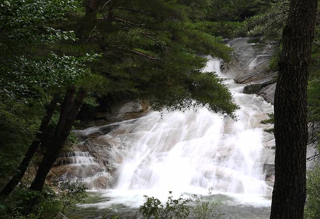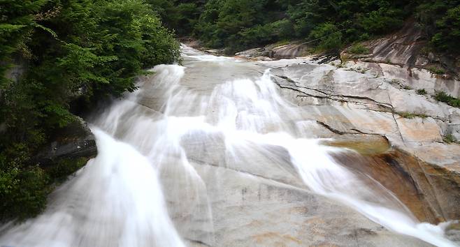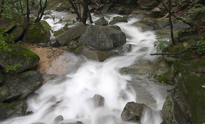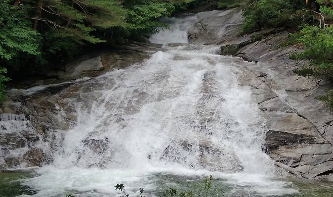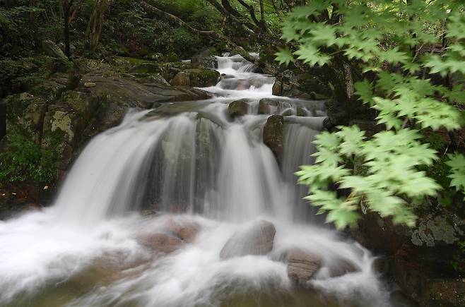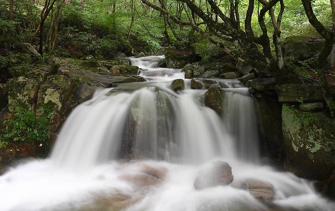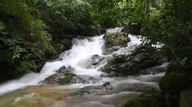 11일 경남 거창군 위천면 상천리 금원산자연휴양림의 계곡이 장맛비의 영향으로 시원한 물줄기를 자랑하고 있다.이곳 거창 금원산자연휴양림은 무더위를 날리고 일상의 지친 몸과 마음을 치유하기에 최고의 장소로 꼽힌다.