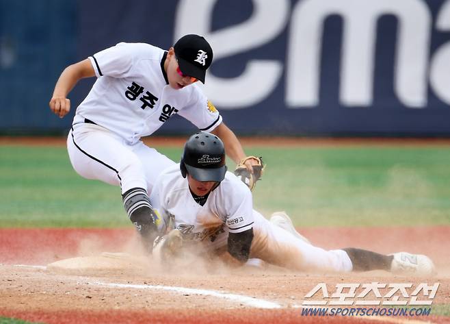 제79회 청룡기 전국고교야구선수권 대회 16강전 안산공업고와 광주제일고의 경기가 11일 서울목동야구장에서 열렸다. 3회말 2사 1,2루 안산공고 안병용의 3루 도루를 광주일고 김성준이 차단하고 있다. 목동=박재만 기자pjm@sportschosun.com/2024.07.11/