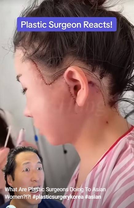 제가 유튜브에서 종종 보는 한국계 미국인 성형외과의사의 영상을 소개한 적도 있습니다. #plasticsurgerykorea (한국 성형외과)라는 해시태그를 단 영상에서 2~30 대로 보이는 젊은 여성이 '안면거상술'을 받은 영상을 보면서, 이 미국인 의사가 큰 충격을 받는 내용이었습니다.