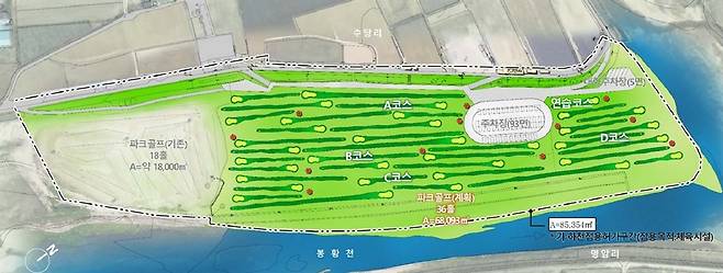 | ▲ 충남 금산군 봉황천 파트골프장 확장공사 계획도면. 올해 들어 기존 파크골프장 인접 부지에 36홀을 추가하는 확장공사를 벌였다. 모두 54홀 규모에 주차장 150대, 화장실 등 기반 시설을 갖췄다. 올해 1월부터 벌인 확장공사에만 모두 21억8600만 원(국비 6억 원, 군비 15억8600만 원)이 사용됐다. |
