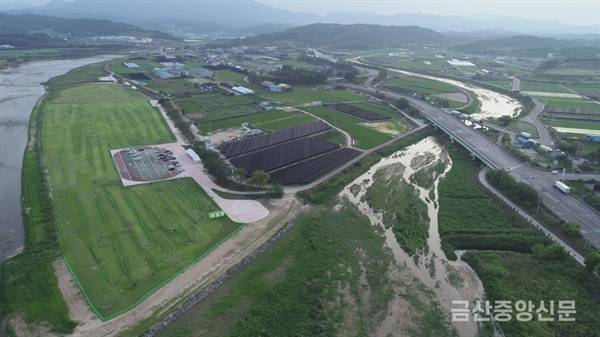 | ▲ 충남 금산군이 올해 상반기 봉황천 둔치(금산군 제원면 수당리 986-1 일원)에 조성한 파크골프장. 사진은 지난 4일 촬영한 것으로 물에 잠기기 전의 모습이다. |