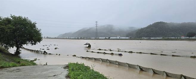 | ▲ 불어난 물에 잠긴 봉황천 파크골프장(지난 10일 촬영). 금산군이 올해 상반기 봉황천 둔치(금산군 제원면 수당리 986-1 일원)에 조성한 파크골프장이 개장 열흘만에 모두 떠내려갔다. |