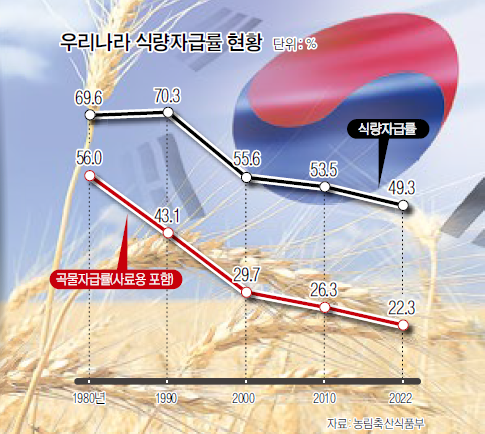 우리나라는 연간 국내 곡물 수요량 2300만t 가운데 1800만t을 수입하는 세계 7대 식량 수입국이다. 농림축산식품부에 따르면 2022년 기준 사료용을 제외한 국내 식량자급률은 49.3%, 사료용을 포함한 곡물자급률은 22.3%다. 쌀 자급률은 100%를 넘지만, 밀·옥수수·콩의 곡물자급률은 각각 0.7%, 0.8%, 7.7%에 불과하다. 이러한 상황은 1990년을 기점으로 계속 악화하는 추세다.