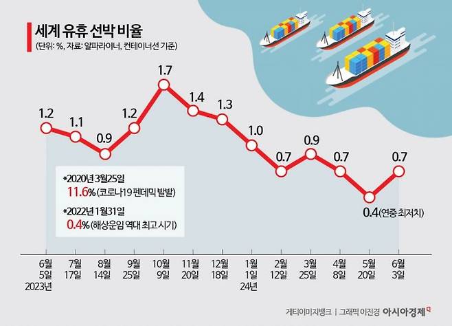 12일 프랑스 해운시장 조사기관 알파라이너에 따르면 지난달 초 기준 세계 유휴선박 비율은 0.7%(컨테이너선 기준)로 집계됐다. 전월에는 0.4%까지 떨어지기도 했다. 유휴선박 비율이 0.4%까지 떨어진 건 해상운임 지표인 상하이컨테이너운임지수(SCFI)가 5000대에 오르며 사상 최고치를 기록했던 2022년 2월 이후 처음이다.