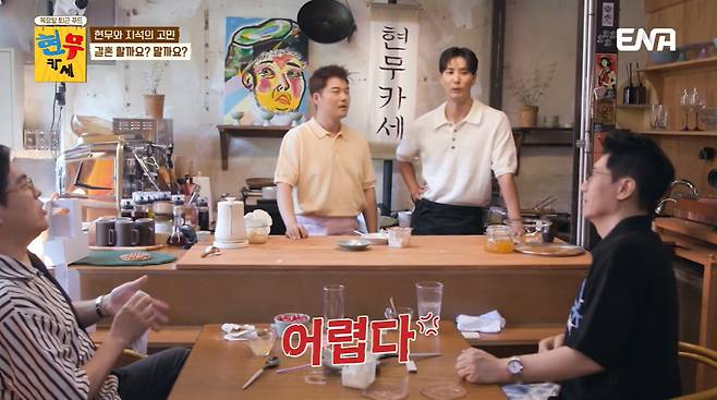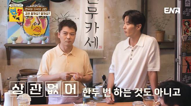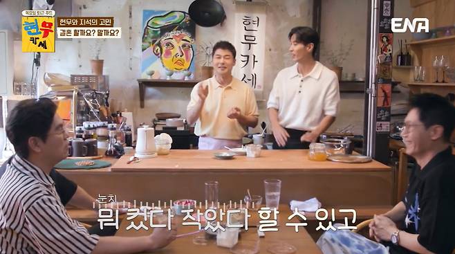 11일 방송된 ENA 오리지널 예능 '현무카세' 첫 회에서는 서울 문래동에 아지트를 오픈한 전현무-김지석이 '절친 형' 김용만, 지석진을 초대해 '형님 맞춤형' 건강 코스 요리를 대접하는 현장이 펼쳐졌다.