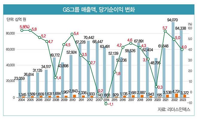 GS그룹의 지난 20여 년간 매출액·당기순이익 변화를 보면 위기감이 더 드러난다. 2012년 그룹 전체 매출액이 70조4420억 원으로 정점을 찍지만 이후 2021년까지 매출 70조 원을 넘기지 못한다. 당기순이익률은 그룹 분리 초기인 2004년, 2005년 5.8%를 나타낸 이후 지난해까지 한 번도 이 수익률을 넘긴 적이 없다. 특히 2013년, 2014년엔 당기순이익 적자를 보기도 했다.
