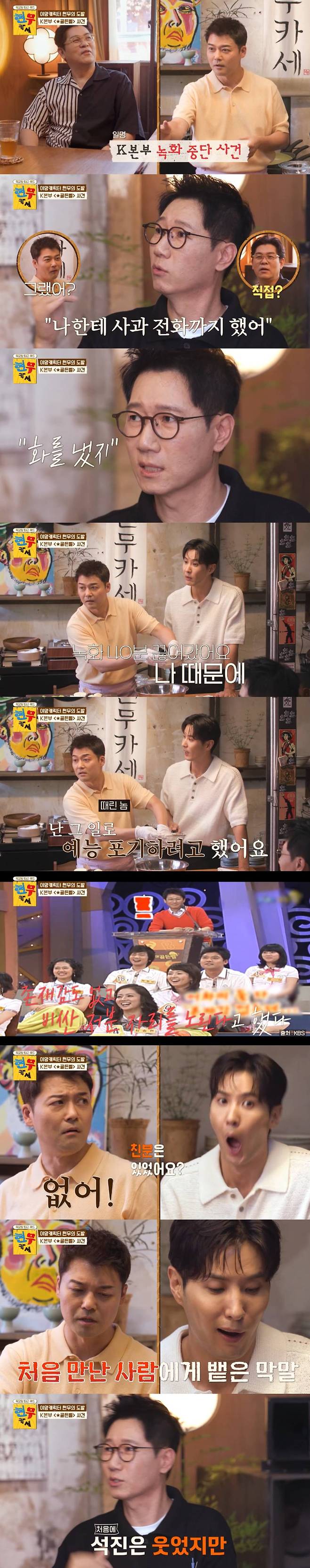 전현무는 "녹화가 40분간 끊어졌다"고 당시를 회상했다. 지석진은 "난 기억이 안난다"며 의아해했고, 전현무는 "난 다 기억난다. 형 때문에 예능 포기하려고 했다. 난 끝났구나 생각했다"고 설명했다.