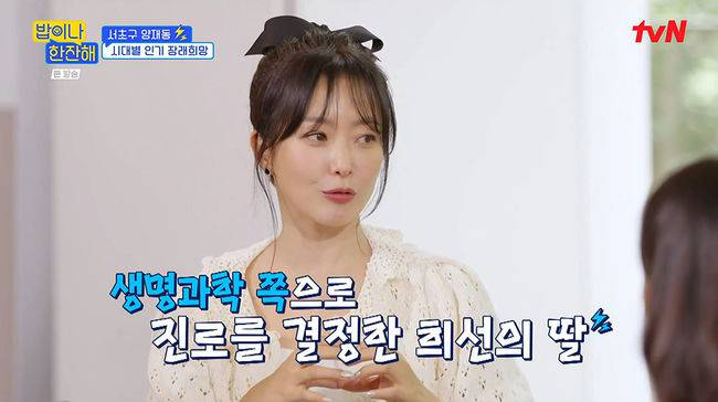 11일 방송된 예능프로그램 tvN '밥이나 한잔해'에서는 김희선, 이수근, 이은지, 더보이즈 영훈이 마지막 모임을 함께 한 가운데 김희선이 딸에 대한 이야기를 꺼냈다.