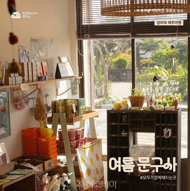 엄마와 함께 가면 좋을추쳔여행지는 제주시 구좌읍 세화리에 있는 아날로그 감성 문구점 '여름문구사'이다. 추억 소환 아이템이 가득한 이 문구점은 엄마와 동심으로 돌아가기에 안성맞춤인 공간이다. 독특하고 재미난 소품들 가운데 마음에 드는 문구류를 함께 고르며 취향을 공유하고, 어릴 적 즐겨 먹었던 추억의 불량식품을 나누어 먹으며 지난 이야기에 푹 빠져보자. 수박을 닮은 비키니와 비치볼 등 인테리어 소품들 사이에서 인생샷을 남기는 재미도 빼놓을 수 없다. 유년 시절로 돌아간 듯한 엄마의 해맑은 미소를 보는 것만으로도 가슴이 따뜻해질 것이다.