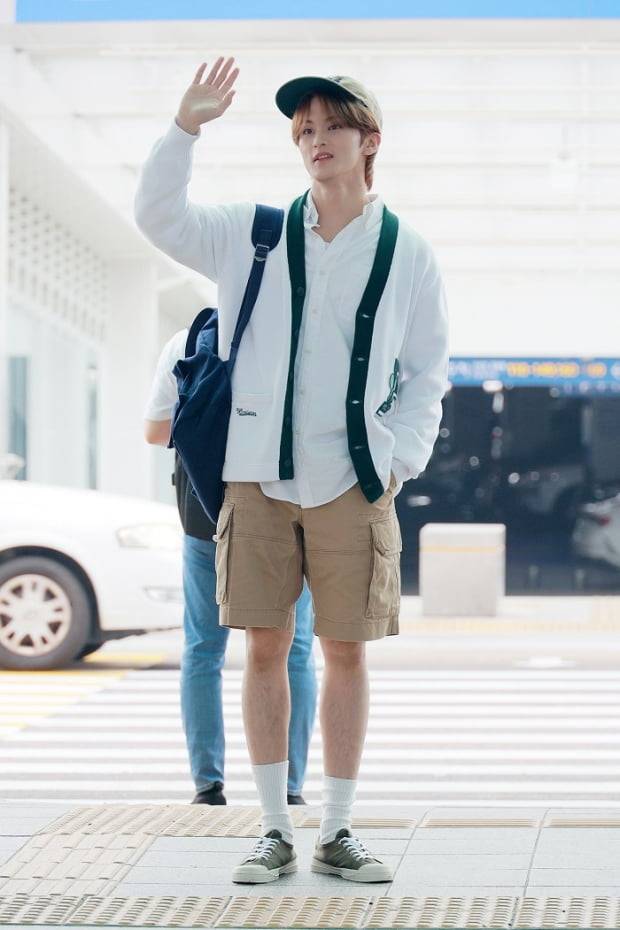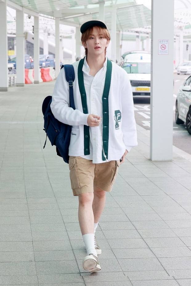 출국에 앞서 마크는 'P' 레터링 패치가 돋보이는 화이트 가디건과 화이트 셔츠를 매치, 여기에 적당한 길이감의 카고 쇼트를 착용해 깔끔하면서도 캐주얼한 무드를 연출했다.