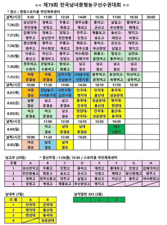 제79회 전국남녀종별농구선수권대회 대진표가 확정되었다.