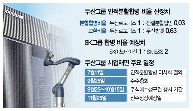 이 같은 흐름은 사업 재편을 추진 중인 SK그룹 입장에서도 주목할 수밖에 없는 상황이다. SK그룹은 17일 이사회를 열고 SK온의 모회사인 SK이노베이션(096770)과 SK E&S의 합병을 결의할 예정이다. 두산그룹과 달리 SK는 더 복잡해질 수 있다. SK E&S는 비상장사라 기업 평가를 어떻게 할 것인지 선택지가 다양하다. SK이노베이션의 주가가 낮게 형성돼 있어 주주들 입장에서는 불리하게 작용할 가능성이 높다. 시장에서는 SK이노베이션과 SK E&S의 합병 비율이 1대2 수준으로 정해질 것으로 보고 있다.