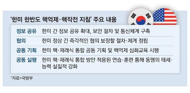 이번 지침에 따라 앞으로 훨씬 많은 미국 전략자산이 한반도에 더 자주 전개될 전망이다. 핵추진 항공모함, 핵무기 탑재 잠수함, 전략 폭격기 등 미군 전략자산과 연계한 한미 간 핵·재래식 통합 훈련도 늘어난다. 국방부는 이날 "이번 공동 지침은 북핵 위협 억제와 유사시 대응을 위해 미국 핵자산에 한반도 임무가 전시는 물론 평시에 배정될 것임을 확약했다"고 설명했다.